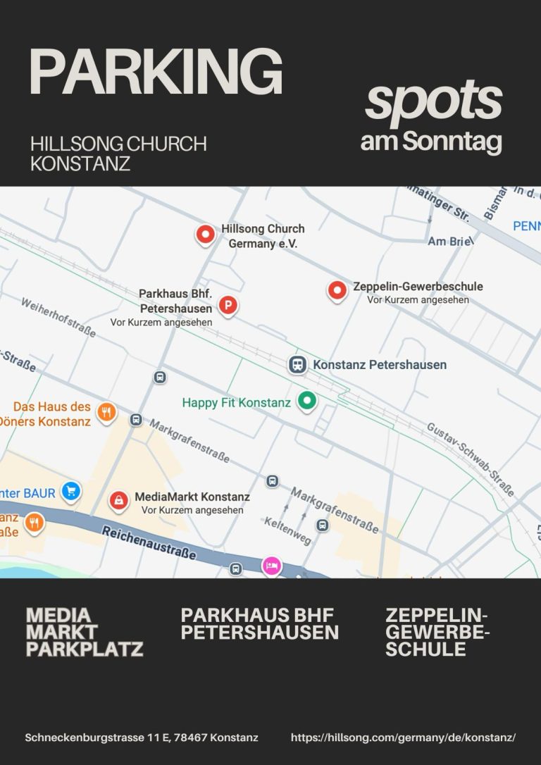Die Hillsong Church ist ca. 500 Meter vom Bahnhof Konstanz-Petershausen entfernt. Die Bushaltestellen Konstanz-Friedhof (Linien 2, 3, 12 & 13) und Konstanz Gottmannplatz (Linie 6) sind ca. 5–10 Gehminuten entfernt.